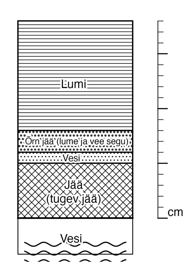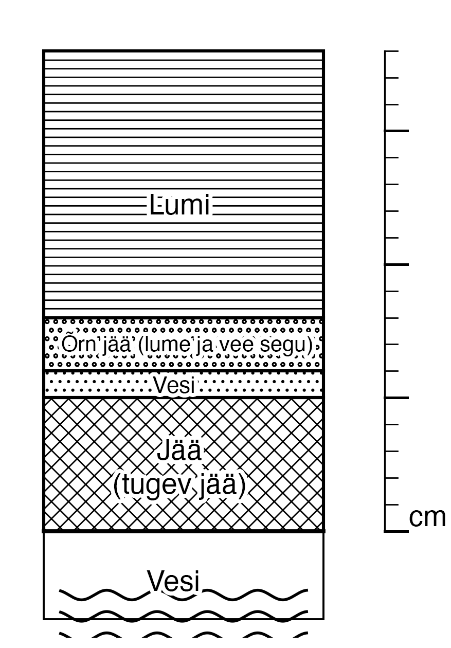 Lumevaiba alla on tekkinud nn topeltjää. Kõige all on umbes 5 cm paksune tugev jää, kuid raske lume tõttu on vesi tunginud jää peale. See omakorda on lume alla tekitanud teise kihi – ebamäärase, krobelise “lume-vee” jää, mis ei ole uisutamiseks turvaline ega ühtlane.
